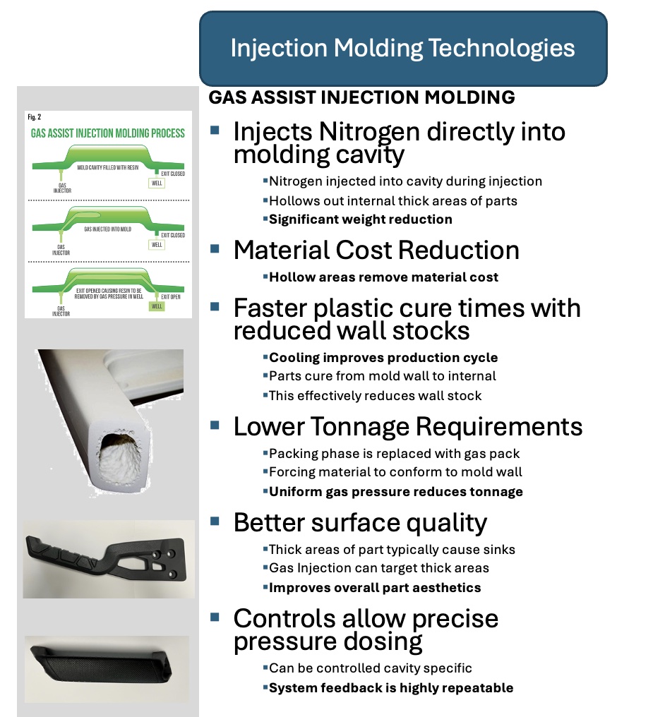 This process can allow large parts to be molded in a lower tonnage press, which can provide an opportunity to reduce the manufacturing cost.